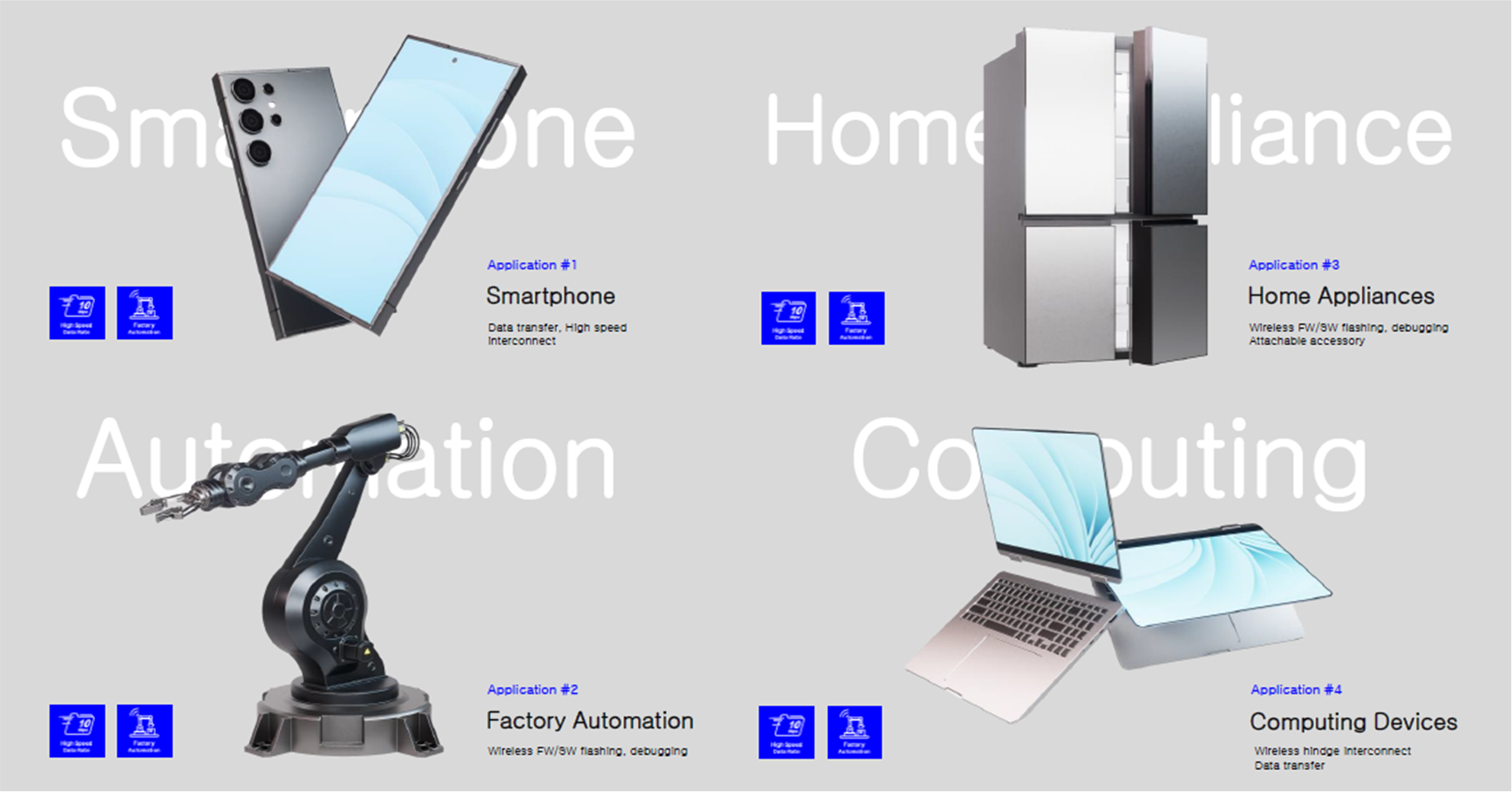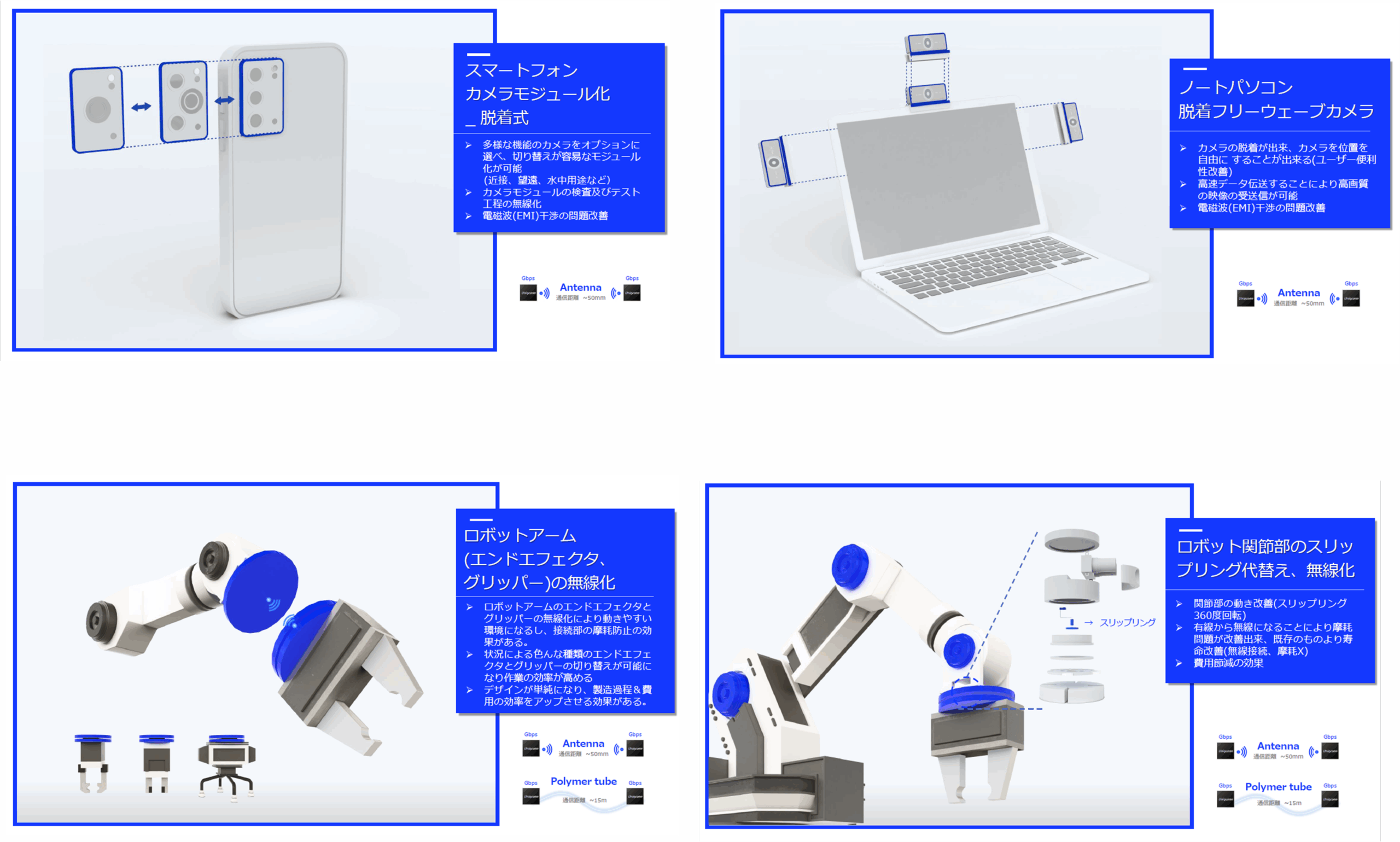 In today's world, where a wide variety of applications require high-speed transmission of large volumes of data, Uniqconn's devices enable completely wireless connections without the need for existing cables or connectors.By reducing problems such as wear and contact failure, deterioration of conductivity, and electronic interference (EMI) in the components required for connections between devices and boards, Uniqconn provides added value by improving the quality of customers' products.